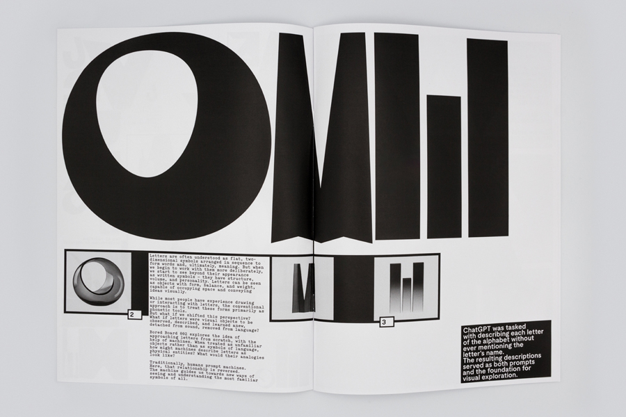 Bored Board 002 explores this idea by approaching letters from scratch with the help of machines. Treated as unfamiliar objects rather than language symbols, how might machines describe letters as physical entities? What would their analogies look like?